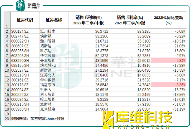 而由于原材料成本上漲,今年上半年各主要工業機器人廠商的毛利率普遍同比下降,只有兩家企業的毛利率同比上升。