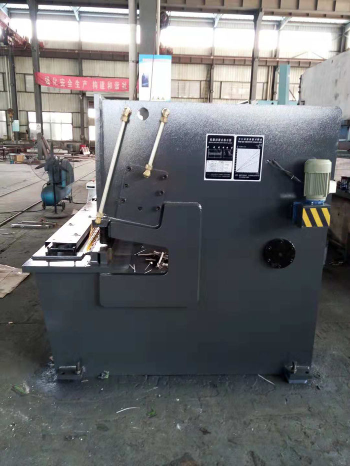 采用鋼板焊接結(jié)構(gòu),液壓傳動(dòng),氮?dú)飧谆爻獭2僮鞣奖悖阅芸煽浚庑蚊烙^。 刃口間隙調(diào)整有指示牌指示,調(diào)整輕便迅速。 設(shè)有燈光對(duì)線裝置,并能無(wú)級(jí)調(diào)節(jié)上刀架的的行程量。 采用柵欄式人身安全保護(hù)裝置。 后擋料尺寸及剪切次數(shù)有數(shù)字顯示裝置
