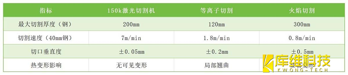 傳統等離子切割或水刀工藝在超厚板(≥40mm)加工中普遍面臨效率低、熱影響區(qū)大、切口粗糙等問題。而150k激光切割機通過以下技術參數實現跨越式升級: