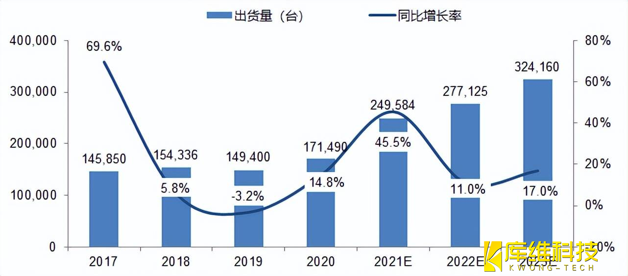 根據相關數據表明,2020年中國工業機器人市場出貨量為17.15萬臺,同比增長14.8%,預計2021年中國工業機器人市場出貨量將為24.96萬臺,同比增長45.5%。長遠來看,中國工業機器人市場發展空間廣闊,行業需求也將穩速增長,國產替代趨勢不改。